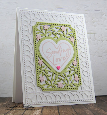 2nd, card, using the same small die of the month and the stamp sent of the month.  Cut the frame from white, then cut the center frame from green and pink.  I cut the little pink flowers out and glued them to the green layer where the flowers were.  The center 'sending love' was stamped in a light pink, due cut then layered.